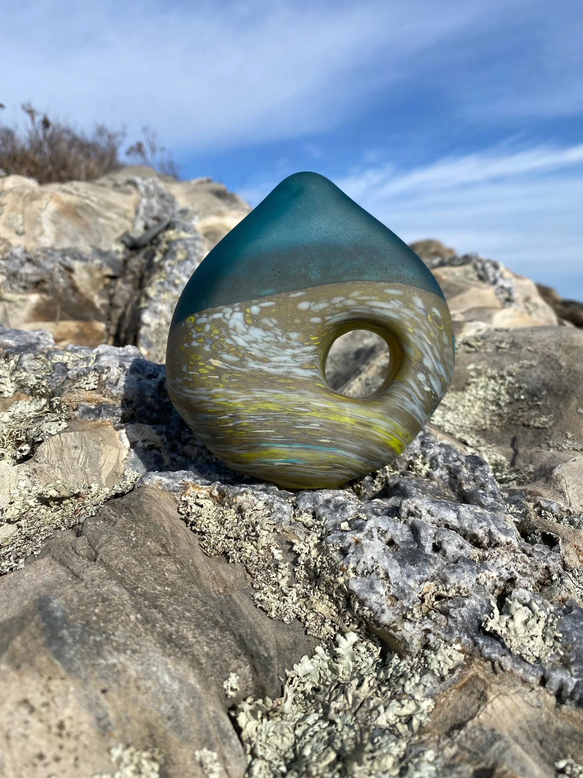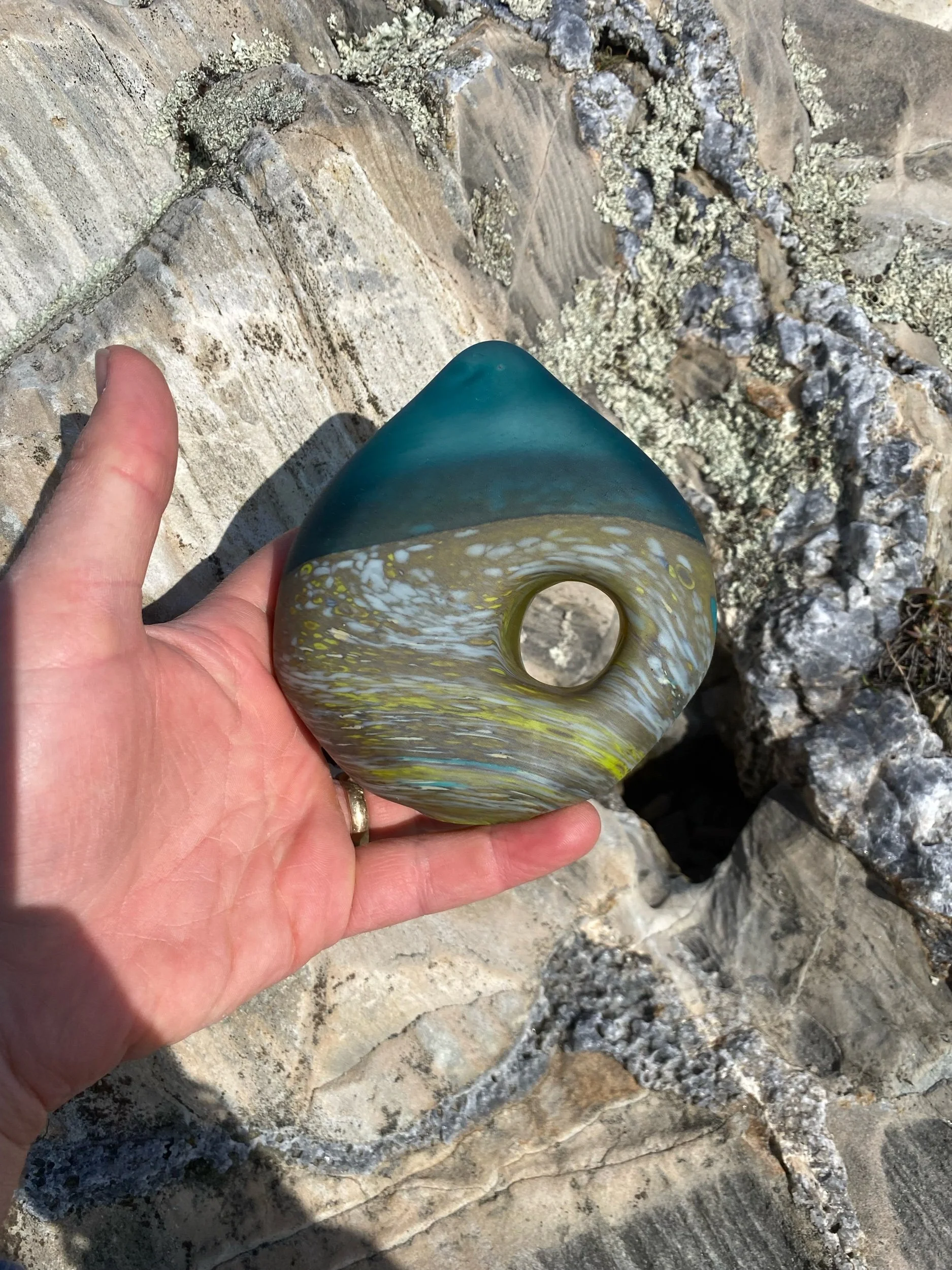 These Touchstones represent just that. A contrast of light catching, Transparent colored glass , with an opaque multi colored section.