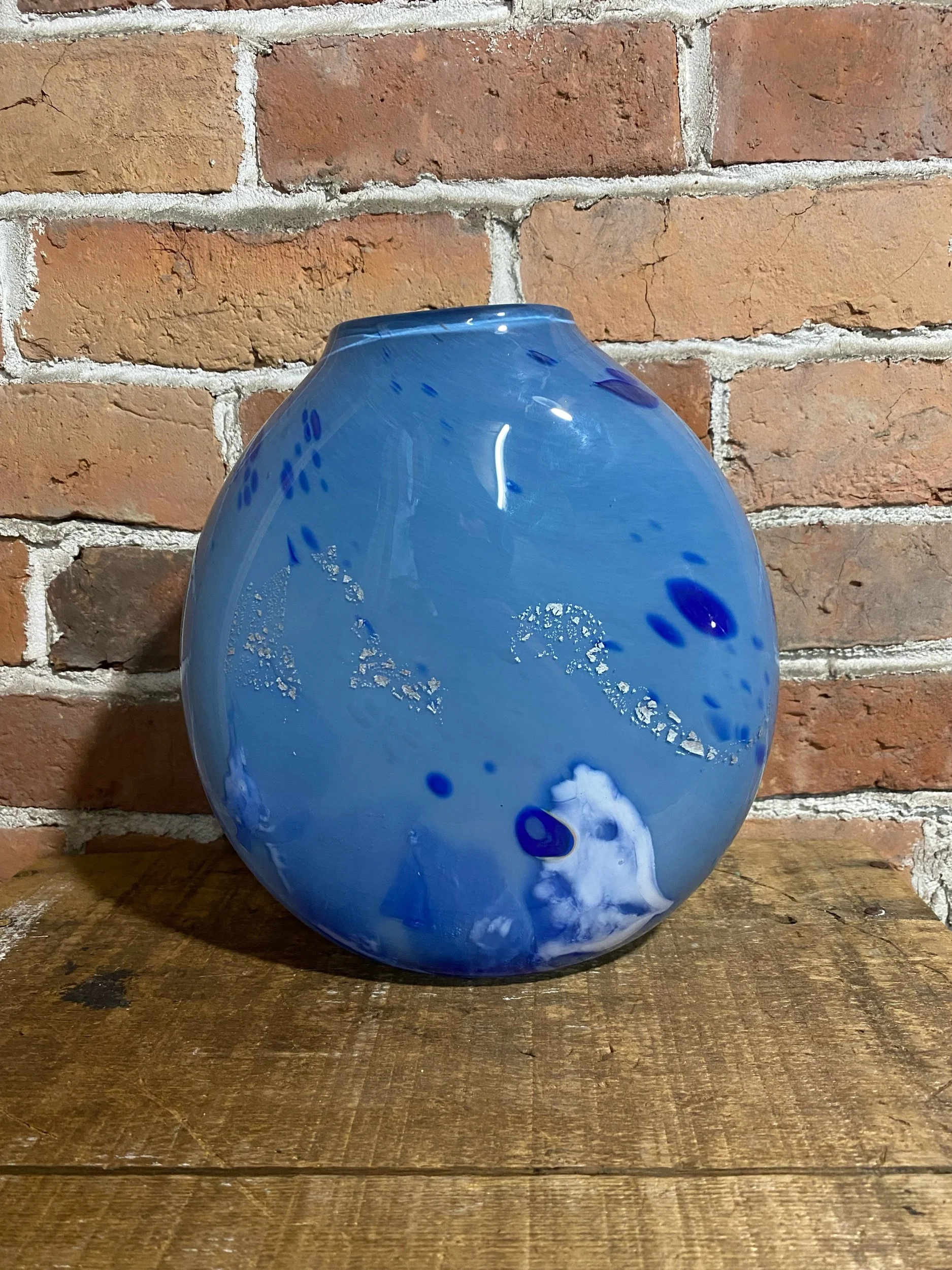 This one of a kind hand blown vase sits at 8” tall x 8” wide x 3” deep