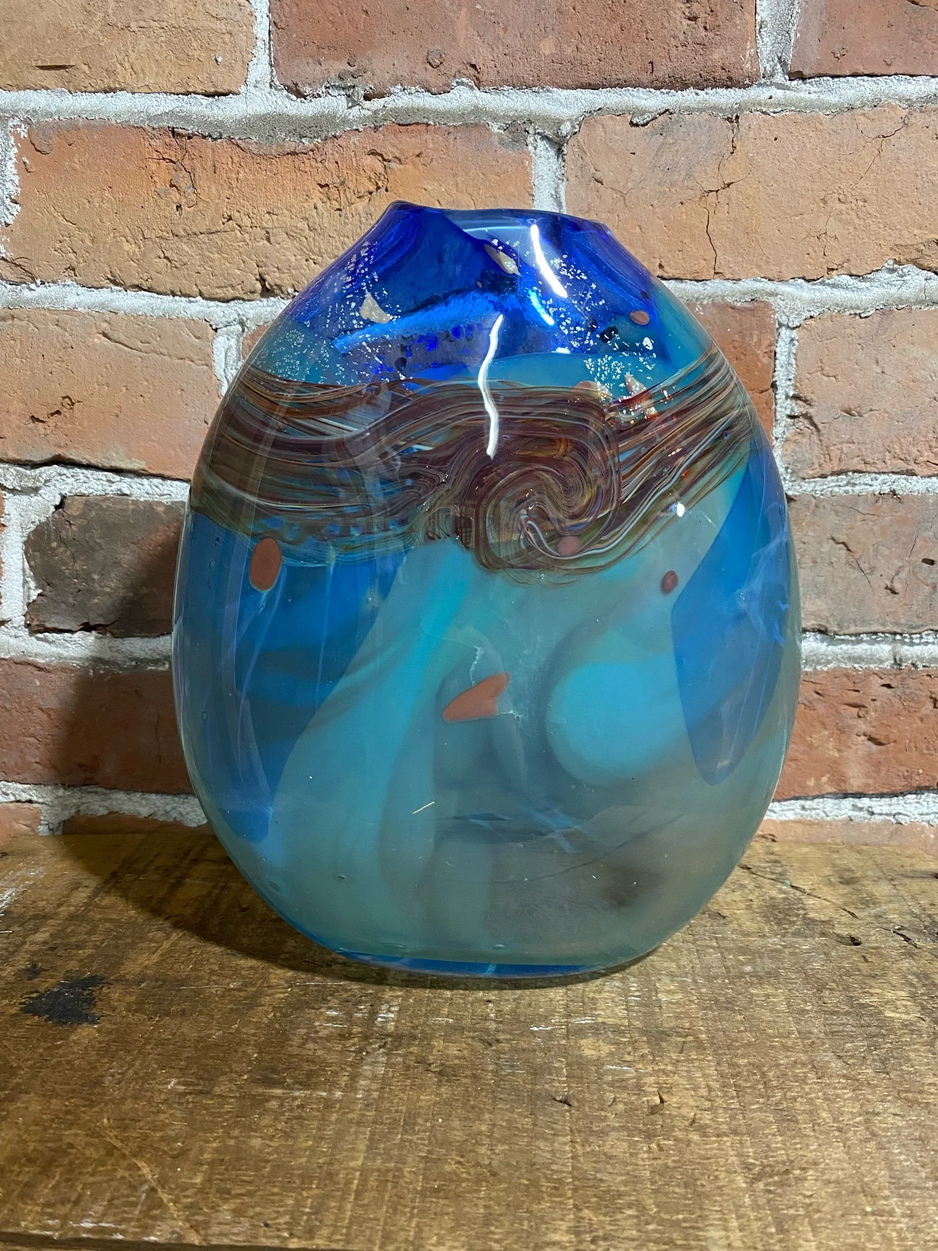 This one of a kind, hand blown glass vase stands at 9” tall x 7” wide x 2.5” deep